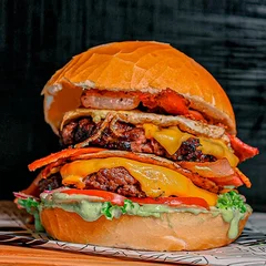 Pão australiano, maionese verde, alface, tomate, 2 burgers de fraldinha 200g, 2 ovos, 2 fatias de presunto, queijo prato em dobro e bacon em dobro