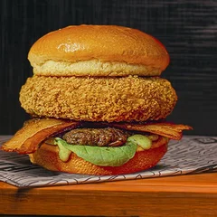 Pão brioche, Maionese verde, rúcula, Burger de fraldinha 100gr, Bacon em tiras, Catupiry com costela desfiada empanado.
